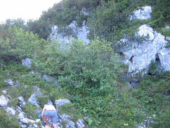 Wir gingen auf eine kleine Felswelle zu. Latschenüberwachsen. Da war auf einmal eine kleine Höhlenöffnung. Wir gingen hindurch und kamen jenseits davon wieder im nächsten Eingang heraus. Da war ein richtiges "Felsenmaul" - breit einfach. Da führte ein Hohlsteintunnel nach unten, tiefer..... Nichts anderes war in diesem Gebiet bekannt.... Das "mußte" die "Almberghöhle" sein. Oder?
