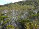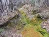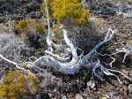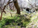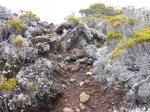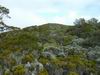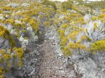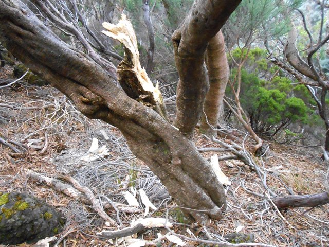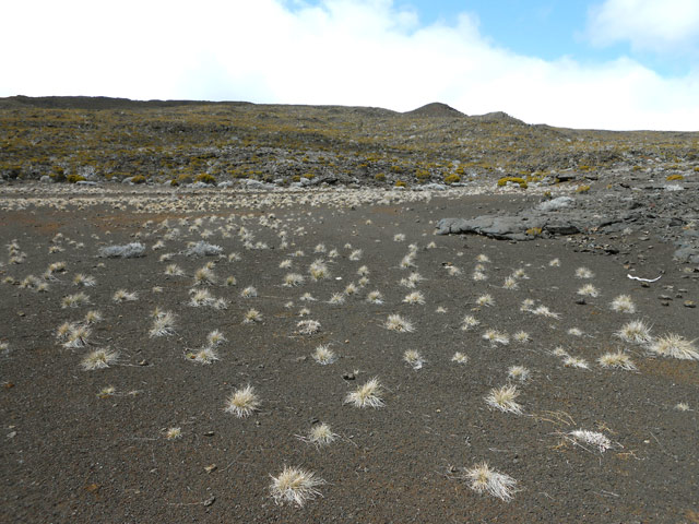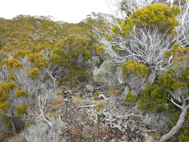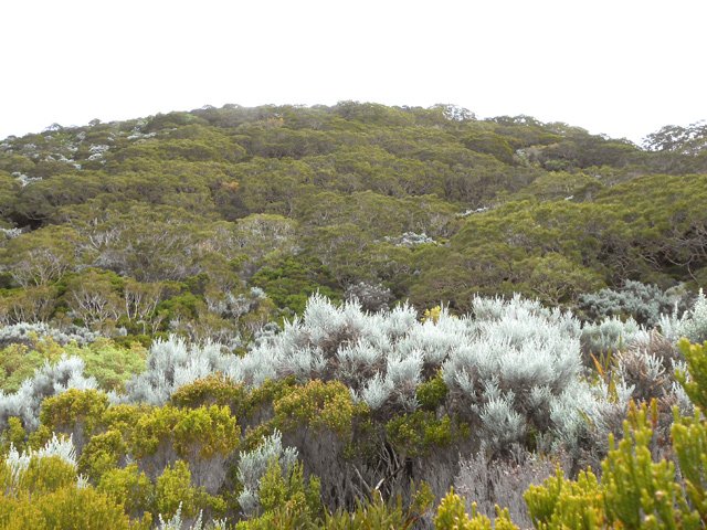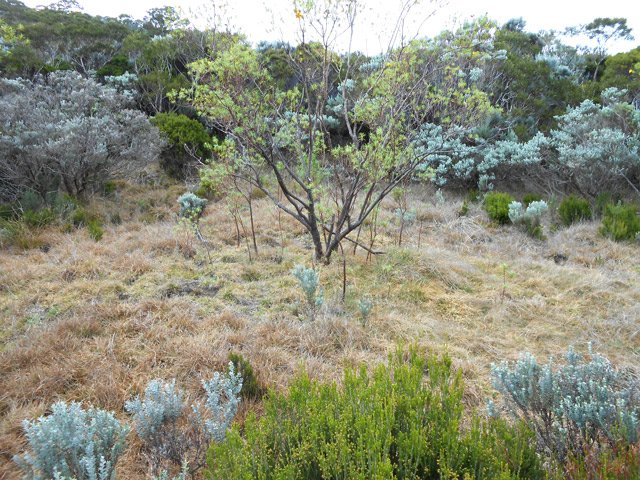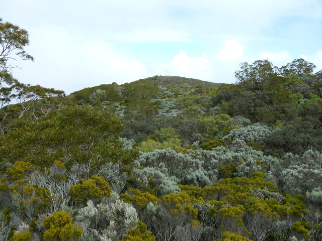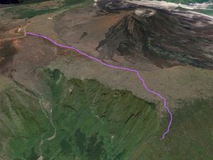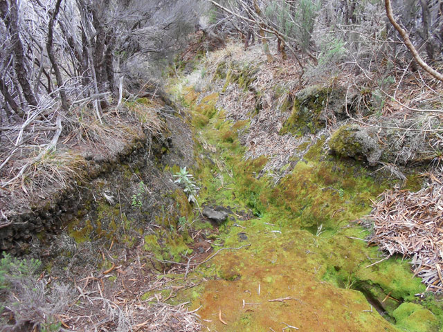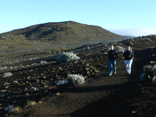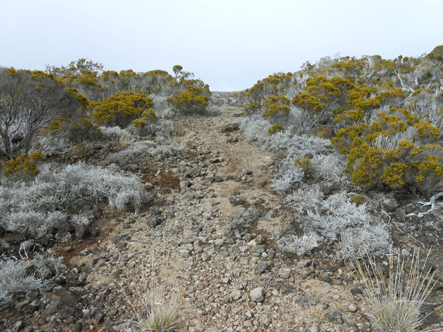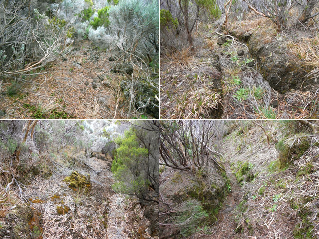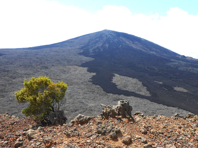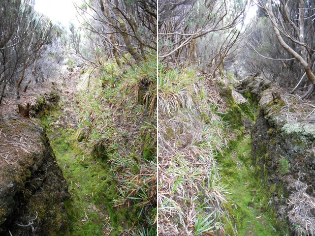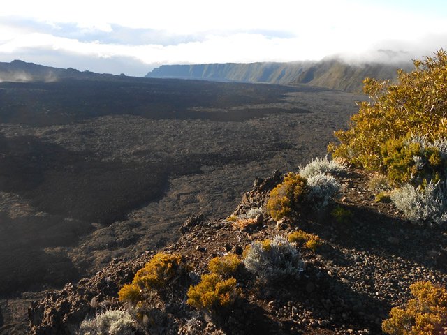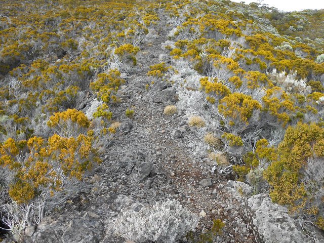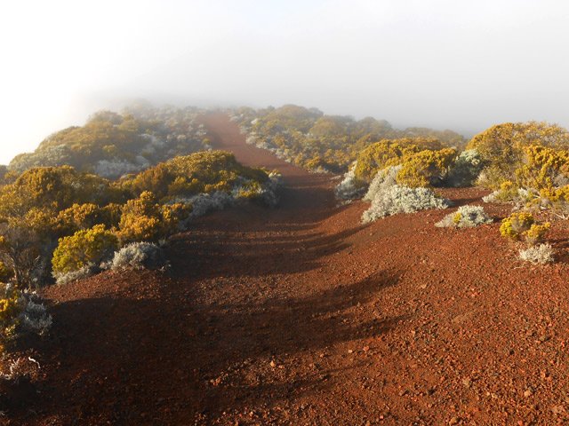 La randonnée débute le long de la route forestière du Volcan et ses milliers d'ornières, au grand parking du point de départ du GRR2 en direction du gîte de Basse Vallée. Le sentier démarre sur des plaques de basalte et devient sableux par endroits. Il passe au plus près de la Grotte du Chisny puis d'un oratoire dédié à la Vierge fait de dalles de lave empilées. La pente est très faible dans la descente qui part vers le Piton Rouge et le sentier très large. Une piste longe le sentier et l'on peut choisir l'un ou l'autre itinéraire, s'il n'y a pas de vététistes. Le sentier est toujours agréable dans sa végétation rase (Photo 1). On rencontre tour à tour du sable, de la terre, des cailloux qui roulent sous les pieds, de l'herbe, des plaques de basalte, sans jamais rencontrer de difficulté. On se rapproche tranquillement du Piton Rouge en moins d'une demi-heure (Photo 2). Il porte bien son nom, surtout en fonction de l'ensoleillement qui fait ressortir les teintes chaudes de ses flancs. Il est plus rouge avec le soleil couchant qu'après le lever où il paraît plus gris. Guetter les arcs-en-ciel blancs si une brume légère stagne au-dessus du sol au moment où le soleil monte (voir § ci-dessous). Le rempart est désormais très proche et il est impossible de s'égarer car le sentier le suit au plus près sans pour autant le longer de trop près, ce qui pourrait s'avérer dangereux par brouillard (Photo 3). On bénéficie, à partir de là, de superbes points de vue sur la Fournaise (Photo 4). De petites senties permettent de s'approcher au plus près du rempart abrupt et dangereux (Photo 5). La végétation a du mal à grandir mais devient de plus en plus touffue. Prendre, au premier croisement à droite en direction de Jacques Payet, le sentier qui démarre aux panneaux et poteaux de l'ONF. Il est plus caillouteux que le précédent, plus étroit aussi et très mal balisé (Photo 7). Il vaut mieux ne pas y passer par fort brouillard car les discrètes balises blanches sont très espacées. On alterne plaques basaltiques et marches hautes pierreuses séparées par des parties sableuses ou caillouteuses, le tout bordé de racines blanchies par le soleil (Photo 8). La végétation dépasse rarement les 80 cm. Ralentir au passage d'une ravine aux trous souvent remplis d'eau et qui se prolonge par un canyon de 3 ou 4 m de haut et de large car la bifurcation approche. Plus loin, on longe une minuscule ravine en empruntant parfois le fond à sec. C'est là, sur la droite, que débute le sentier oublié. Les 300 premiers mètres ne changent presque pas en comparaison de ce qui vient d'être fait même si le passage est plus étroit (Photo 9). La végétation grandit doucement et le sentier est facile à suivre. On retrouve les mêmes racines ou branles morts qui laissent leur squelette vieillir au soleil (Photo 10). Devant, la petite colline affiche une bonne idée de la végétation de cette zone où tout pousse mieux que plus haut (Photo 11). Plus on descend, plus le sentier devient étroit mais reste facile à deviner en se penchant si nécessaire pour le repérer sous les brandes (Photo 12). Une hésitation est possible près d'une minuscule clairière où trône un bout de tuyau en ciment composite, vestige sans doute de travaux non finis à l'époque. Il ne faut pas voir ce tuyau (c'est qu'on est allé trop loin) et rester au plus près de la trace, mi sentier, mi ravine caillouteuse, le tout recouvert de végétation (Photo 13). On rencontre même des touffes de calumets qui ont du mal à grandir mais offrent de belles tâches de verdure (Photo 14). On rencontre ça et là quelques troncs pourrissants creusés au coupe-coupe pour en extraire les zendettesLarves de capricornes très consommées sur l'île, crues ou cuites., signe que des gens passent ici au moins pour venir chercher un peu de nourriture (Photo 15) ! Durant près de 100 mètres, c'est le GPS qui est le maître et il faut lui faire confiance, à condition que la trace de l'appareil sur les 6 km précédents épouse au plus près le trait rouge de la carte. Si ce n'est pas le cas, conserver le même écart en parallèle. Une fois ces 100 m effectués, avec ou sans inquiétude, on parvient à une ravine encaissée dotée de deux belles grottes (Photo 16). Le sentier reprend, très large et de bonne qualité malgré le manque de fréquentation (Photo 17). On emploie des bribes de sentier de l'époque, bien marquées, profondes et bordées de branles (Photo 18). Il longe ou utilise un fond de petite ravine, passe près de zones rocheuses entre deux autres ravines (Photo 19). Ne pas manquer dans cet environnement très sauvage les grottes bordées de tamarins (Photo 20) ou le sol moussu d'un très beau vert (Photo 21). Les petites clairières permettent de souffler mais attention pour retrouver la suite du sentier (Photo 23). Prendre à gauche à ce qui semble être la fin du sentier et descendre dans la ravine de gauche par la sente des braconniers. Le sol, couvert d'herbe, est plat. La grotte, de plusieurs mètres de large peut abriter une demi-douzaine de personnes dans un endroit silencieux que même les merles ont déserté (Photo 27). L'endroit est idéal pour un ermite très sportif en mal de méditation ! Si on regarde la trace en pointillés noirs sur la carte on voit que le sentier se poursuit vers l'ouest mais il est trop difficile à repérer. Tant pis pour le panorama sur Grand Pays ! On retrouve au retour les mêmes difficultés qu'en venant, la pente positive en plus. Attention : En raison des risque d'égarement, ne pas partir sans tenir compte des conseils suivants : vérifier les piles du GPS, ne pas partir par fort brouillard, ne pas descendre seul les derniers 1500 mètres, prévoir des manches longues, de la boisson et de la nourriture. Repérer la ravine à quelques mètres au nord de la trace : en cas de doute, il vaut mieux suivre la ravine que de se griffer dans la haute végétati