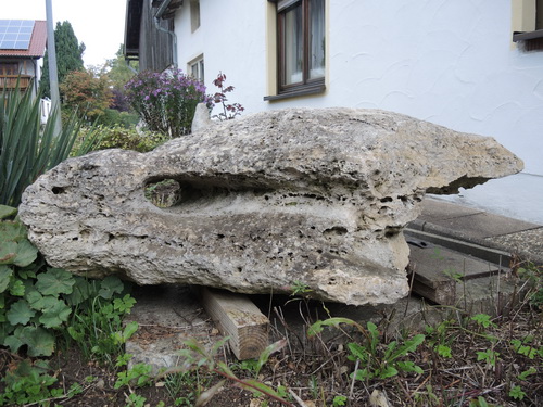 Dann kommt der Ort Holnstein. Da wirds schon wieder geschäftiger, was man allein schon an den vielen Lks merkt, die durchs Land brummen. Warum dieser Name? Gibts da vielleicht eine Höhle? Ja, und die ist schon von der Straße her auszumachen. Unterhalb des Tuffberges, auf dem die Dorfkirche steht, sind mehrere Höhlenöffnungen zu sehen. Einige kleinere sind heute in einer Garten einbezogen, der auch eine Mariennische hat. Und das ist ein richtig großes ebenerdiges Portal neben einem landwirtschaftlichen Nutzgebäude. Wieder liegt Gerümpel herum, ein altes Waschbecken zum Beispiel. Um bis ans Ende zu kommen, muß man schon eine Lampe dabei haben. Hinten wird es richtig finster. Es lohnt sich, sich da umzuschauen. Man bekommt richtige Tropfsteine zu Gesicht, schwer beschädigt zwar, aber was anderes kann man hier ja nicht erwarten. An einigen Stellen sind auch die versteinerten Zweige zu sehen, aus denen der Tuff besteht. Ganz am Ende lag zurückgelassenes Grabwerkzeug und langer Strick, vermutlich von Kindern, die hier gegraben haben. Erstaunlich ist die Höhe der spaltenartigen Höhle. Das ist kein kleines Mickerloch! Ein bißchen Pflege bräuchts halt.