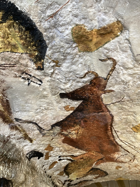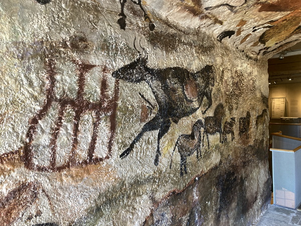 Hat man ein Eintrittsticket ergattert, dann weiß man, wann man sich am Eingang einzufinden hat. Man wird in kleinen Gruppen geführt und muß sich schon auf 2 1/2 Stunden Führungszeit einrichten. Zuerst bekommt man seine Kopfhörer, mit deren Hilfe man in 11 verschiedenen Sprachen den Ausführungen folgen kann, dann geht es in einem gläsernen Aufzug um ein Stockwerk höher, wo man auf einer Aussichtsplattform landet, dem Belvédère, von wo aus man einen Prachtblick auf die Umgebung hat. Nun geht es wieder abwärts in einen schmalen schluchtförmigen Gang, der zum "Shelter" führt. Man betritt eine Betonkunstcaverne und es wird dem Besucher mittels eines Films die Zeit der Entstehung der Bilder gezeigt - eine Zeitreise. Damals wuchsen hier keine Bäume, sondern es gab hier eine Tundralandschaft. Der Eingang zur Höhle von Lascaux lag nicht verborgen im Wald, sondern der Eingang war schon weitem wegen seiner Größe gut zu sehen. In animierten Szenen sieht man auch die damals vorkommenden Tiere, die Pferde, die Bisons, die Rentiere, die Mammuts. Dann macht man eine Sprung und landet im Jahre 1940. 4 Jugendliche tauchen auf und das Abenteuer der Entdeckung von Lascaux beginnt. Die sehr sachkundige Führerin erzählt nun die Geschichte, wie der Eingang gefunden wurde und was gleich danach alles passierte - auf dem "chemin de la découverte". Man geht weiter und kommt vor den Eingang zur neuen künstlichen Höhle. Im Vorraum ist alles schon dunkel, dann heißt es: "Etês-vous prêt?" und sie öffnet das Tor. Das ist so ein Wow-Moment. Schon steht man mitten im Höhlenraum. Links von einem kommt schwach das Licht von draußen herein, einen kurzen Abhang geht es herunter und schon steht man in einem Tunnel. Es ist kühler aus draußen, die Geräusche gedämpft, und natürlich ist des dunkler. Gleich fangen die Malereien an und scheinen nicht mehr aufzuhören. Einfach großartig.