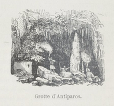 S. 637 "Die H. auf der griech. Insel Antiparos zeichnet sich nicht sowohl durch ihre Größe als vielmehr durch die Schönheit ihrer Tropfsteingebilde aus, welche Früchte, Blätter, Festons usw. bis zur täuschendsten Aehnlichkeit vorstellen und von blendend weißer Farbe sind."