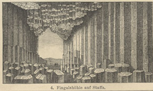 "Diese Höhle zu beschreiben wird jederzeit große Schwierigkeiten haben; nichtsdestoweniger sei es versucht. ..der Eingang ein Portal...Er ist in der Tat ein solches, ein Spitzbogentor, und dahinter das wunderbare Schiff einer gotischen Kirche. Wer London und die Westminsterabtei kennt, den wird der gotisch-phantastische Bau, den die Natur hier gebildet hat, immer wieder an die Kapelle Heinreichs VII. elrinnern. Der Basalt lieferte die Säulen, die freilich in ihrer Ineinandergefügtheit mehr den Eindruck einer Wandflächeals eines Pfeiler- oder Säulenganges machen würden, wenn nicht die Wellen, mit einer bewundernswerten Regelmäßigkeit, Nische neben Nische in der Basaltwand ausgehöhlt hätten. Dadurch ist, wenigstens scheinbar, eine Pfeilerreihe entstanden, indem alle konkaaven Vertiefungen, wie in einem dunklen Hintergrunde liegen, während die lichtbeschienen Ecken, wie selbstständig und losgelöst, sich pfeilerartig in den Vordergrund stellen. Auf diesen Pseudopfeilern ruht nun die Decke... Fontane, Staffa 655