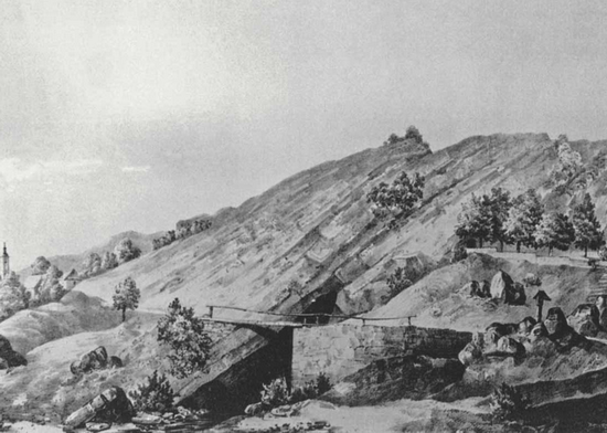 1777 | "Ausblick aus einer Höhle auf eine hügelige Landschaft" von Caspar Wolf | https://uzb.swisscovery.slsp.ch/discovery/fulldisplay?docid= alma990058318920205508&context=L&vid=41SLSP_U ZB:UZB&lang=de&adaptor=Local%20Search%20Engine |