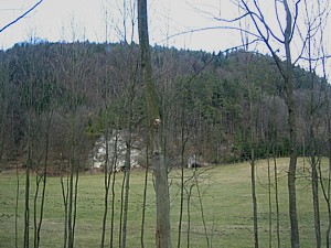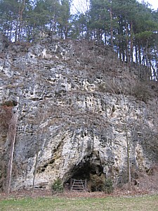 Wenn man bei Scheiblingkirchen in das Schlattenbachtal abbiegt, dann sieht man bereits von der Straße aus, kurz vor Innerschildgraben, auf der linken Talseite die Eingänge in die Lämmerhöhle. Auf immerhin 47 m Gesamtganglänge haben sie die Vermesser der Höhle offenbar erfaßt, weil dieser Welt im Niederösterreichischen Höhlenbuch angeben wird. Noch immer wird sie zumindest für Lagerzwecke genutzt, wie der Stapel Ziegeldachplatten zeigt, der dort aufbewart wird (Februar 2008). Der linke Teil des Höhle war früher mal abgemauert. Es steht sowohl die Eingangsmauer als auch im Höhleninnern eine niedrige Mauer noch, die sie vom übrigen Höhlenteil abgrenzen sollte. Ein paar verrostete Eisenreifen sind auch noch vorhanden. Ansonsten sind die Räume leer, was auch schon hervorzuheben ist, weil das bedeutet, daß kein Müll drinnen ist. Mir mit vor allem das Felsloch aufgefallen, das zwischen den beiden Höhleneingängen noch heute an der Außenseite zu sehen ist. Vermutlich wurde es früher durchaus zu praktischen Zwecken genutzt, z.B. zum Festbinden von Tieren.