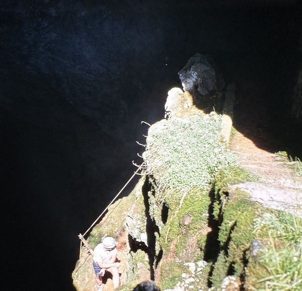 Der alte Steig zur Kolowrathhöhle verfällt immer mehr, weil er nicht mehr gepflegt wird. Teilweise ist er gar nicht mehr vorhanden. Viele Drahtseile sind schon gerissen, die eisernen Halteklammern sind des öfteren schon aus der Wand gerissen. Wenn da nicht bald was passiert, dann ist dieser höhlenkulturhistorisch höchst bemerkenswerte Weg bald verloren. Bei der Höhle zogen wir uns um und kamen gerade noch zur rechten Zeit. Die Sonne schien direkt in das Eingangsportal und bewirkte ein wunderbares Nebellichtspiel bis hinab zum Hallenboden. Wir konnten herrliche Fotos machen. Vom ehemals prächtigen Höhleneis ist fast nichts mehr zu sehen. Ein Eisboden in der Mitte der Halle, zwei winzige Eisflecken am Boden, das ist alles, was heute noch übrig ist. Spektakulär war der Wasserfall, der aus der Decke pritschelte. Im hintersten Winkel der Riesenhalle (160 m lang, bis 40 m breit, 36 m hoch) ging es dann über aus der Decke hängende Seile in SRT-Technik noch ein bißchen weiter...