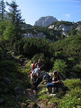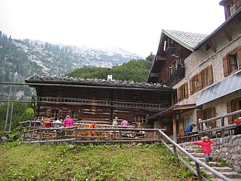 Dann kommt endlich das Kärlinger Haus in Sicht. Es steht oberhalb des Funtensees mit seinem unterirdischen Abfluß in die Teufelsmühle. Das Haus ist heute auch an Wochentagen sehr stark frequentiert. Manchmal muß es da schon zu richtigen Überfüllungsszenarien gekommen sein, aber wo soll man schon hin, da es keinerlei Alternative gibt. Mehrmals kann man auf Schildern lesen, daß es am Königssee, zum man noch 3 1/2 Stunden Fußmarsch vor sich hat, keine Übernachtungsmöglichkeit gibt. Das letzte Boot ist dann abgefahren und wer zu spät kommt, der muß wohl beim Bootshaus irgendwie biwakieren.