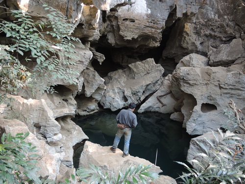 Liviu hatte eigentlich für die Tage der "Internationalen Speleological Expedition LAO 2017" die Parole ausgegeben, daß wir nur zur Höhlenforschung und nicht zum Höhlentourismus unterwegs seien. Er ließ nebenbei die Bemerkung fallen, daß wir die Dan Makhia eigentlich zu 60 % aus dem Grund befahren würden, daß ich gute Photos vor ihr machen könnte. Wie sich gezeigt hat, lag er da am Ende ziemlich daneben, da man in Höhlen, wie man auch hier sieht, nie ganz sicher sein kann, daß da nicht irgendwo doch noch unbekannte Höhlenteile vorhanden sind oder irgend etwas anderes noch zu entdecken ist. Und Forschungsergebnis können sich nicht nur in vermessenen Metern niederschlagen, sondern auch z.B. in antropospeläologischen Beobachtungen. Was man finden wird, das weiß man naturgemäß nicht, aber offen für Überraschungen sollte man immer sein. Das macht ja gerade den Reiz des Aufsuchens von Höhlen entscheidend aus. Mir passierte das im Eingangsbereich der Höhle. Da türmt sich eine ansehnliche Sinterfigut in der linken Höhlenseite auf. Als ich sie ein wenig genauer anschaute, stutzte ich. Was war da am Boden? Da lag ein Kip-Geldschein, befestigt mit zwei Steinen am Rand eines Sinterbeckens. Da hatte wohl jemand ein Geldopfer gebracht - mit welchem Ziel auch immer. Aber er glaubte wohl an eine magische Wirkung, wenn es das tat. Mit unserem nüchternen westlich-rationalistischen Denken ist das nicht mehr zu vereinbaren, aber diese Sichtweise wird keineswegs überall auf der Welt geteilt, auch heute noch nicht.