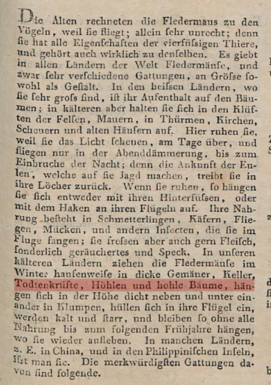 "Die Frage, wie Fledermäuse im Dunkeln navigieren, beschäftigt aufmerksame Besucher schon lange. Bis ins 18. Jahrhundert nimmt man an, sie hätten einfach sehr gute Augen. Dass sie sich tatsächlich mit den Ohren orientieren, findet erst der italienische Priester und Naturforscher Lazzaro Spallanzani heraus, indem er Fledermäusen die Augen aussticht. Seine Zeitgenossen kümmern sich allerdings nur um seine Ergebnisse..." Passig, Handbuch 227