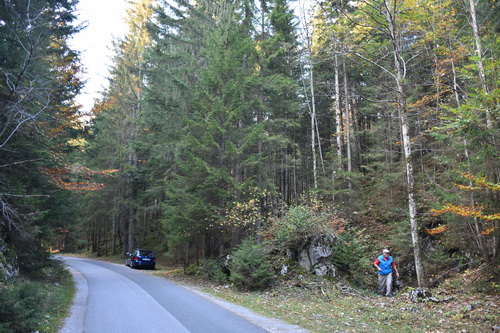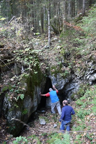 Gleich hinter der Mautstelle der Trattbergstraße liegt die Abzweigung zu zwei Höhlen im Gerngraben. Sie zu finden ist nicht einfach. Wir haben jedenfalls im Jul i 2012 erst einmal eine gute Stunde herumgesucht, ehe die erste Höhle vor mein Aug kam. Vor etwa 10 Jahren war ich schon einmal dort gewesen und wir haben eine Höhle besucht. Aber sie wiederzufinden, das war einfach nicht möglich. Es galt den Ausdruck "Forststraße" zum Beispiel zu interpretieren, da im Gelände 2 vorhanden waren. Und die Höhenangabe im Salzburger Höhlenbuch paßte überhaupt nicht mit der zusammen, die meine GPS- ausgerüstete Digitalkamera zeigte. So irrten wir herum und suchten. Ich finde das eine höchst aufregenden Tätigkeit, da man in diesen Momenten intensivst das Gelände mit seinen Augen und Verstand durchkämmt. Und da sah ich auf einmal weit unterhalb der unteren Forststraße einen verdächtige Felsformation. Von einem Höhleneingang war überhaupt nichts zu sehen. Es galt sich einzulassen auf das Spiel zwischen den eigenen Kräften, der inneren Stimmung, dem Durchhaltswillen, auch der Bereitschaft, wieder einmal frustriert zu werden, weil sich am gedachten Zielort überhaupt nichts als potentieller Höhleneingang auftun tut. Hier war es anders. Da war auf einmal deutlich der Eingang zu einem Felsloch zu sehen. Lange ist da schon niemand mehr gewesen, was überhaupt kein Wunder ist. Mehrere Felsen waren inzwischen in die enge Eingangsspalte schon wieder gefallen. Wahrscheinlich war hier seit 10 der 20 Jahren keiner mehr gewesen. Ein bißchen in der Tiefe mit den Füßen gewühlt, da gab ein großer Block wenigstens nach. Der andere war nicht zu bewegen, was sich beim Rausschlupfen als Trumpfkarte erwies, weil wir dort unsere Füße postieren konnten, um auch wieder noch oben uns durchzurampfen.