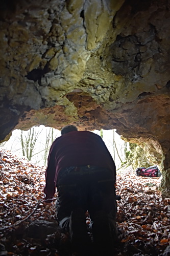 17. März 2002 Auf einer Frühfrühlingstour ins Obere Altmühltal besuchen Willi und ich noch die Bärensimahöhle (ein Mann namens Sima soll dort der Sage nach wie ein Bär gehaust haben) und die Klufthöhle westlich der Bärensimahöhle im Spindeltal. Beide Höhlen sind nur bei stärkstem Lokalinteresse erwähnenswert. Irgend jemand scheint an der Bärensimahöhle noch Interesse zu haben. Im Eingang steckte ein geschnitzter Baumschwamm mit den Initialen FL und ein paar abgebrochene Äste in Felslöchern.