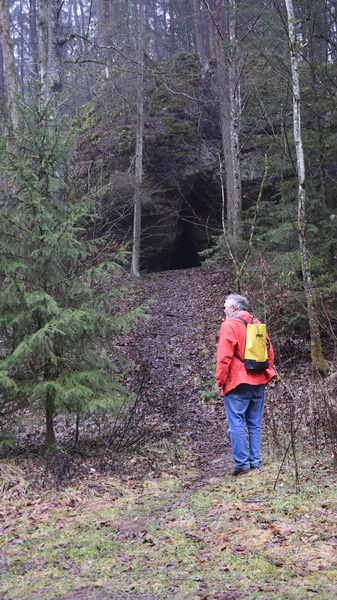 Am südlichen Ortsausgang von Steinfeld zweigt von rechts ein kleines Seitental herein. Eine Seitenstraße zweigt von der B22 ab und führt über eine Brücke weiter. Dort entgeht dem aufmerksamen Auge nicht der Höhleneingang in einer Felsgruppe. Man muß ein paar Meter hinaufsteigen und kommt so in einen horizontalen Höhlengang, der dann nach hinten zu niederiger wird und ein wenig noch weiterführt. Es dürfte sich hier um eine der Engelhardtschen "Urwohnungen" handeln. Nicht weit davon sind noch zwei weitere Felsenkeller, die teilweise nur gemauert somdern, teilweise aber mit einer kleinen Naturhöhle verbinden sind. Sie wurden einstmals als Kartoffel- und Rübenkeller genutzt, als hier noch ein Bauernhaus stand, das inzwischen schon abgerissen worden ist.