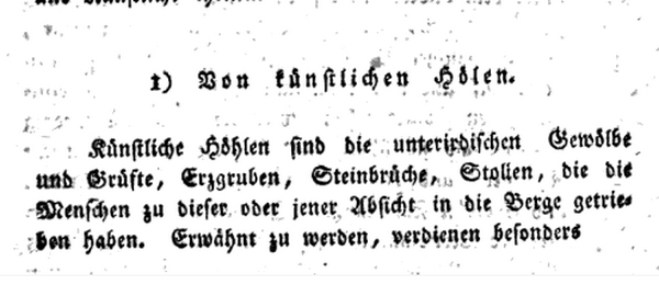 Warum "Künstliche Höhlen"? Der Höhlenbegriff hat sich im Laufe der Jahrhunderte gewandelt und auch nicht. In der "Höhlenkunde" von Franz Kraus, 1894 erschienen, ist das, worum es hier geht, im Kapitel "Künstlich geschaffene Höhlen und höhlenartige Hohlräume" abgehandelt. Es fällt allerdings auf, daß er Bergwerke und ähnliches nicht aufgenommen hat. "Die meisten künstlichen Höhlen aus der älteren Zeit, sin din weiches, leicht zu bearbeitendes Material (Läß, Schlier, weiche Kreide etc.) eingegraben, wie dies überhaupt dem primitiven Zustande der Werkzeuge in der betreffenden Zeit entspricht. Auch sind diese künstlichen Höhlen nicht von bedeutenderen Dimensionen. Größere künstliche Höhlen in festem Gesteine stellen sich bei näherer Untersuchung zumeist als alte Stollen oder bergmännisch abgebaute Steinbrüche aus späterer Zeit heraus." (S. 178)