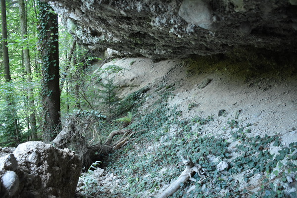 Ich bin dem gesamten Weglein aufwärts gefolgt bis zum Traunfall. Immer wieder gibt es seitlich Felsüberhänge, aber keiner hatte den beschriebenen Charakter. Von einer ausgewaschenen Uferhöhle war nirgends etwas zu sehen, die immerhin 11 m Tiefe erreichen sollte. Auf eine Breite von 7 m sei der Höhlenboden abgegraben worden, ein Damm aufgeschüttet und eine Kammer von 6 m Breite, 3 m Tiefe und 2,3 m Höhe geschaffen worden. Starke Holzpfähle seien senkreicht eingeschlagen worden und man habe ein Geflecht aus Weidenzweigen dazwischen angebracht. In der Mitte befinde sich eine Feuerstelle. Im vorderen Höhlenbereich habe man westseitig noch eine Feuerstelle und um eine kreisförmig angebrachte Vertiefung seien auf Steinblöcken ebenfalls Bretter als Sitzmöglichkeiten gelegt worden.
