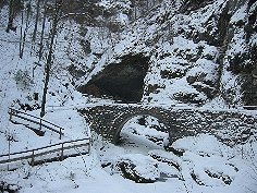 Für mich war diese kleine Tour zum Höhleneingang ein ganz schönes Erlebnis. Einfach mal nur überhaupt den Eingang finden. Wo nur lag er? Keine Ahnung. Je länger ich ging, desto mehr fragte ich mich, ob ich nicht "falsch" wäre. Aber auch hier hat sich Ausdauer ausgezahlt. Auf einmal war er ja tatsächlich da, der verschneite Höhleneingang. Hoch oberhalb der Eingangsregion ist die betonierte Fahrstraße zu sehen. Da fahren alle Leute über die Höhle und haben keine Ahnung davon, was sich unter ihren Füßen befindet!