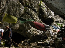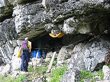 Der Eingang entgeht dem kundigen Auge nicht. Ein breites schwarzes Maul öffnet sich in den gebankten Felszonen. Ein ausgetretener Weg führt hinein in die Eingangszone der Höhle. Man steht am Grunde eines großen Schachts, der seitlich mittels ein paar Stahlstiften und einem Halteseil wieder verlassen werden kann und als Weg hinauf ins Plateau benutzt werden kann. Außerdem ist hier die "Waschstelle" und nicht weit davon der mit einem Stacheldrahtnetz abgedeckte zweite Schachteinfang. Der Haupteingang ist voll mit Material. Große Plastiklagertonnen stehen herum, Schnüre sind gespannt, an denen Kleidungsstücke zum Trocknen aufgehängt sind, mehrere Schüsseln sind aufgestellt, wo Wasser aufgefangen wird, tibetische Gebetsfahnen flattern im kalten Höhlenwind und der Klang eines Windspiels ist dauernd zu hören.