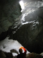 Schade, denn die Höhle ist z.B. für den Fotographen ein Schmuckstück, aber nur in manchen Jahren und meist nur zu Zeiten, wo sich üblicherweise keiner den Berg dort hochquält. Wir steckten wirklich bis zum Bauch im Schnee, pflügten uns mühsamst durch die steile weiße Pracht, erschöpft, durchnäßt und ziemlich durchfroren, aber wir erreichten den Eingang, der nicht blockiert war, stiegen ein, fanden unberührtes Eis vor, noch im Wachsen begriffen, an einer Stelle hing ein knallroter dünner Eisstalaktit von der Decke, so etwas hatte ich noch nirgends gesehen. Wenn wir ihn nicht gesehen und fotographiert hätten, wäre er halt einfach mal von oben nach unten gefallen, wie so viele andere auch, es hätte ein feines Geräusch gegeben, wenn er unten aufgekommen wäre, niemand hätte es gehört hat, weil keiner sonst dagewesen wäre. Wen interessiert so etwas schon? Wirtschaftlicher Nutzen? Keiner. Das BSP beeinflußt? Einfluß auf die Börse? Nein. Uninteressant.