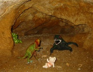 Zurück ging es den denselben Weg. Es hieß wieder hinein in das kalte Loch zu klettern, wo es doch draußen so schön warm war. Es half nichts. Also wieder leiterhoch und seilrunter, Rutschen auf dem Holzbrett, in einem niedrigen Gang, wo man sich seitlich bücken mußte, lagen schon Skistecken bereit mit denen man sich abstützen konnte. Beim Rausgehen wusch sich keiner mehr die Stiefel vorher ab, eh er aufs Brett ging. Die kleine seitliche Kammer blieb diesmal unbeachtet, wo ein kleines Podest an die Wand gemacht worden ist, auf dem eine Schnapsflasche und ein paar Gläser dauernd in der Höhle stehen. Auch die kleinen Kinderspielfigürchen wurden nicht mehr wahrgenommen, die an verschiedenen Stelle der Höhle postiert sind: eine Ratte, eine Riesenspinne, verschiedene Saurier.