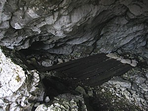 Ein paar nüchterne Fakten aus dem Salzburger Höhlenbuch Band 1: Die Höhle ist unter der Ziffer 1339/19 im Höhlenkataster erfaßt. Als Forschungsbeginn ist 1821 angegeben, aber der Eingang war sicherlich immer schon bekannt. Die Eingangshöhe liegt in 1.670 m. Als Gesamtganglänge wird ca. 50 m angegeben, die Höhendifferenz, wegen des Tagschachts, beträgt 15 m. Das Gestein ist Dachsteinkalk. Schaut man am Eingang genau hin, dann sieht man die Grenzmarkierung zwischen Bayern und Salzburg, die zu Beginn des 19. Jahrhundets, nachdem Napoleon endlich die politische Bildfläche wieder verlassen hatte, angebracht worden ist. Das Höhlenportal wird als 5 m breit beschrieben, und als 3 m hoch. Daran schließt sich der 8 bis 12 Meter breite Hauptraum an, bis 7 m hoch. Früher muß es hier einen richtigen Abfallberg gegeben haben, nachdem auch hier viele Menschen nach dem Motto "Aus den Augen, aus dem Sinn" gehandelt hatten und ihren Müll einfach in die Öffnung des Tagschachts geworfen hatten (Geschieht das nicht heute noch sehr häufig? Wo kommt wohl unser Atommüll einmal hin?) Das, was man oben reinwarf, kam unten wieder heraus. Diese menschlichen Überbleibsel sind heute verschwunden, wohl etwas Positives aus der modernen Verheiligung der Örtlichkeit. Czoernig hat schon 1922 die Höhle vermessen, der Plan von Seiser aus dem Jahre 1941 ist nicht mehr auffindbar.