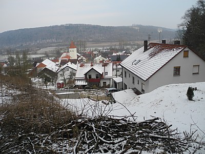 Die Nikolauskirche im Dorf dahinter der Altmühlhang mit den Höhlen |