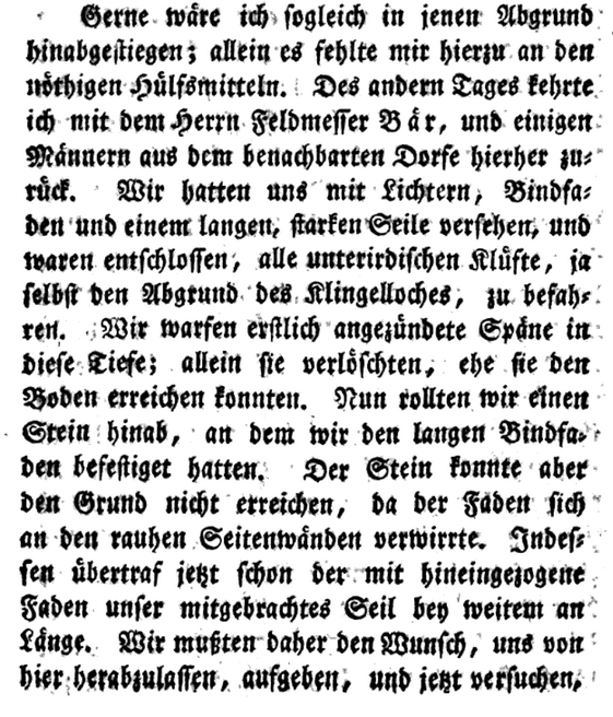 "..Steine, welche man hinein wirft, fallen lange, und verursachen einen klingenden Schall". Das war der Grund, warum diese den Menschen der Umgebung immer schon bekannten Höhle, bei ihnen den Namen "Klingloch" trug. Neben dieser akustischen Qualität hat die nach dem "Pfarrer und Superintendenten in Uttenreuth bei Erlangen" (Neischl) Johann Friedrich Esper von Goldfuss benannte Höhle (im "Umweltatlas" steht, daß er sie "entdeckt" hätte, was Quatsch ist), die bei Kyrle als eine "Höhle im Raumverfall" im fortgeschrittenen Zustand (Kyrle 77) anzusprechen ist, auch eine ästethische. Lang beschreibt sie als "eine der eindrucksvollsten Höhlen der Fränkischen Schweiz" (Lang 86).