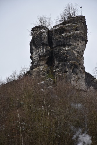 Der Ort ist ein Höhepunkt für Naturliebhaber, in dem Felsmassen wie Türme unnahbar mitten im Ort aufragen und das mit dem "Judenhof" einen der idyllischten Plätze der ganzen Fränkischen Schweiz birgt. Von dort sind es nur noch ein paar Minuten Aufstieg bis zu Fahnenstein. Bereits unterwegs trifft man auf einen kleinen Felsdurchgang. Der eigentliche Zustieg zum Vorgipfel geht durch eine richtige kleinen Höhle, das Fahnenstein-Felstor B 150. Richtige Warnschilder stehen da, die nur Geübten den Zustieg anraten. Ein dickes Tau hängt herunter und vielen Steinstufen sind in den Fels gehackt, so daß das alles wirklich kein Problem für einen halbwegs wendigen Menschen ist. Am Zustieg ist eine weitere kleine Höhle hinter einer Aluleiter, die heute (2004) den Weg nach oben vollkommen unproblematisch macht. Es sieht so aus, als sei auch hier mal eine Art kleine Wohnhöhle gewesen. Die richtige Wohnhöhle, liegt ein paar Meter weiter am Wandfuß entlang, heute bei einem Wasserspeicher. Massiv sind die Fels bearbeitet, so daß man horizontale Flächen aus den Wänden herausbekommen hat, die wohl früher zu Wohnzwecken genützt worden sind (Beim Besuch 2025 hatte man den Zugang mit einem massiven Absperrgitter abgeschlossen. Warum eigentlich?). Folgt man dem Wanderweg entlang des Dolomitriffs oberhalb von Tüchersfeld weiter, so kommt man irgendwann wieder an einem großen Wanderparkplatz heraus, wo eine schöne Naturbrücke am Hang noch zu sehen. ist