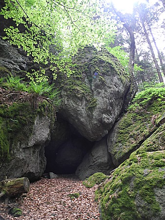 Zwischen Cham und Schönthal ist auf den Wanderkarten von einer "Bärenhöhle" zu lesen. Am 30. April 2007 habe ich mal versucht, diese "Höhle" zu finden. Am Ende war es furchtbar leicht, denn ein mit vielen Schildern markierter Weg "Gr1" (in Frankreich wäre das wohl die "Grande Route") führt direkt hin. Trotzdem - an so mancher Stelle war ich mir wirklich nicht sicher, wohin mich das Schilder denn eigentlich führen wollte. Wo ein verdrehter Pfeil nach "unten". Wo war das. Ich bin erst einmal mindestens 100 m in einer ganz andere Richtung gelaufen, als sich am Ende herausgestellt hat, was wirklich "richtig" gewesen war. Am Ende ist es sogar gut, daß der richtige Weg ein Umweg gewesen ist. Denn ich habe viel mehr gesehen, als das eigentlich ursprünglich wohl vorgesehen war. Da war dann auf einmal wirklich diese "Bärenhöhle", ein kleines Versturzloch, in dem sich sogar eine von der Decke herabhängende Plastikhülle befand mit "Informationen" über Bären. Ein richtiger "Fremdkörper" war das. Am "Höhlenboden" war noch eine menschliche Spur, ein mit Steinen markierter Raum für eine Feuerstelle. "When you are in Rome, do as the Romans do". Ein englischer Spruch mit vielen Anwendungsmöglichkeiten. Auch für die Speläophilie. Die Speläologie befaßt sich ja gerne mit größeren und "wichtigeren" Objekten. So ein "Mickerloch" wird ja von echten "-logen" wurde ja wieder und wieder gar nicht aufgenommen in den "Adelsstand" der "Höhlen". Zu "klein", mindestens "5 Meter Länge", vielleicht "Anthropospeläologische Bedeutung".