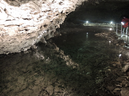 Unsere Führerin war eine reine Freude. Locker, lustig, kompetent. Was für ein Unterschied zur Hermannshöhle, die ich Stunden vorher auch gesehen hatte. Die Räume sind sehr gut ausgeleuchtet, man hat sich überlegt, wie man die Qualitäten der Hohlräume am besten zeigen kann - was auch immer wieder menschliche Eingriffe in die "Natur" notwendig macht, aber man macht das geschickt. Die Highlights waren für mich, als sie ein wenig von der Geschichte der Höhle erzählte. Da gab es tatsächlich Tanzveranstaltungen! Damit hat man wieder aufgehört, warum? Rock im Fels? Verschreckt das alle Höhlentiere? Oder fangen auch die an, sich umzustellen? Wie diese einmal "Krone der Schöpfung", der/die Menschen/Menschen? Ein wachsender Trend: Heiraten in der Höhle! Pikant. Nachdem die Kirchen nicht mehr wirklich "ziehen" für viele, nachdem die Hochzeit im "Rathaus" oft zu nüchtern ist, zurück zu symbolträchtigen Orten! Ein geschäftstüchtiger Schweizer "verhired" sein Labyrinth für viel Geld an verheiratunswillige Paare. Warum dann nicht eine "Höhle"? Das passiert - und in wachsendem Maße. Erwartet man sich davon etwas? Kommt da Atavistisches wieder zu Vorschein, das so mancher schon auf ewig beerdigt zu haben glaubte? Ganz besonders gefiel mir ihre Anmerkung, daß die Bräute, die da "antanzen", in Higheels kommen. Das geht auf dem normalen Weg nur schlecht. Deshalb nutzt man heute wieder den "Betriebsstollen", durch den man halt die notwendigen Erhaltungsarbeiten sonst nur durchführt. Hier habe dann die Braut, noch, so mein Erinnerungsrest, noch "148 Schritte" um es sich noch einmal zu überleben, ob sie wirklich heiraten wolle. Kein dummer Gedanke. Wir haben später in Rübeland darüber nachgesonnen. Warum wartet eigentlich am Ende des Stollens nur ein "Ehemann" auf sie - warum nicht z.B. "5". Unter denen sie sich dann kurzfristig entscheidet. Oder umgekehrt: 1 Bräutigam und 5 mögliche Bräute. Eine moderne Form von "Bauer sucht Frau".