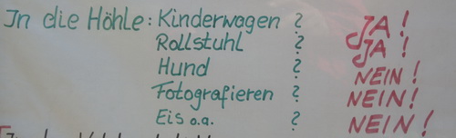 Nicht alles wird durch Zeitablauf auch besser. Als Erhard Fritsch 1988 die Höhle besuchte, beschrieb er seinen Eindruck so: "Trotz sehr geringer Tropfsteinbildungen sind die großen freundlichen Gänge und Hallen der Höhle einen Besuch wert, auch kann problemlos fotographiert werden." Letzeres wird einem heute verwehrt, was ich leider im Mai 2016 bei einem Besuch erlebte. Auch meine Frage warum, man sich so verhalte bekam ich unter anderem zur Antwort, daß die Untere Naturschutzbehörde verboten habe, während der Schauhöhlenführungen zu photographieren und man halte sich daran. Das Verbot sei aus "Sicherheits- und Fledermausschutzgründen" verhängt worden. Mir kommt das so wie Einhornmilch vor - vollkommen sinnlos.