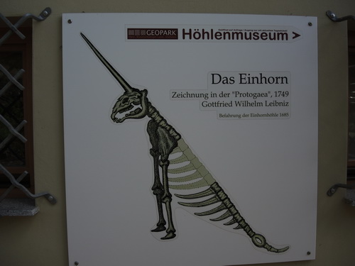 Apropos Einhorn: Diese legendäre Tier gab ja der Höhle sogar ihren Namen. Im 17. Jahrhundert war die Blütezeit des Handels mit diesem Material aus der Höhle. Sogar einen lateinischen Namen hatte man dem Tier verpaßt: "Unicornu fossile". 1686 besuchte der damals sehr berühmte Gelehrte Leibnitz (ein berühmter "Gelehrter" zu seiner Zeit, der aber schnell an Ruf verlor. Für seine Monadenlehre ist er in die Philosophiebücher eingegangen und seine Theodizee halt erst einmal viel, bevor das berühmte Erdbeben von Lissabon passierte..) eigens hier vorbei und untersuchte die Knochen. Er beschrieb in seinem Werk "Protogaea", das Manuskript entstand ab 1691, veröffentlicht wurde es 1749, die gefundenen Knochen als "Unicornu verum", als "Wahres Einhorn". Das machte die Knochen sehr berühmt, von überall kamen Anfragen von Apothekern, das Geschäft blühte. So manche Apotheke mit diesem Namen tauchte in den Städten auf. Man glaubte ein Wundermittel gefunden zu haben, glaubte insbesondere an die potenzsteigernde Kraft des Mittels. Man mahlte die Knochen zu einem Pulver, vermischte sie mit Wasser, so daß eine Art Milch entstand, die man dann trank. Fürstliche Preise wurden dafür verlangt und gezahlt. Am Ende stellte sich dann alles als großer Humbug heraus.