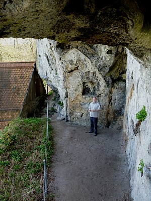 Acht kleinere Höhlen (6624/1) werden von Illich in der 78 m breiten und durchschnittlich 18 m hohen Steilwand des Kalktuffklotzes beschrieben. Die längste davon ist die13 m lange Marderhöhle, die am leichtesten mittels Seilsicherung von oben her erreichbar wäre. Sie wurde 1936 kurz nach der Entdeckung vom Oberlehrer Wallrauch aus Dörzbach ausgeräumt, unprofessionell. Reste von wenigstens zwanzig menschlichen Skeletten will man gefunden haben, Fingerringe aus Bronze, Eisenmesser, Bernsteinperlen, Bronzefibeln, eine keltische Silbermünze usw.. Die Funde liegen zum Teil im Keckenburgmuseum in Schwäbisch Hall. Daneben gibt es noch die "Einsiedlerkapelle", die "Einsiedlerklause", die "Nische", "Kleinhöhlen", die "Grabkammer", die "Untere Nische" und die "Obere Nische". Die ist heutzutage kaum erreichbar, es sei denn, man bringt eine Leiter mit, die man an die Wand anlehnen könnte, um den Überhang überwinden zu können. 6 m breit ist sie, 2 m hoch und führt 4 m tief in den Berg. Die einstmals vorhanden gewesenen Stalaktiten sind alle abgeschlagen. Sie ist wahrscheinlich das "Pritschen-Bebelesloch", das unter diesem Namen von Rosenmüller und Tillesius im Jahre 1805 in ihrer Abhandlung über Höhlen als einzige, zusammen mit der Erdamannshöhle bei Hasel, aus ganz Südwestdeutschland erwähnt werden. An anderer Stelle wird eine "Peitschen-Babele" genannt, die die Anführerin einer Räuberbande gewesen sein soll und ihre Wohnung in der Höhle gehabt habe.