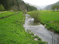 Die Bära ist ein kleines Flüßchen, das von Norden her in Nähe von Fridingen in die Donau fließt. Kaum zu glauben, daß sich so ein Gewässer, so tief in die Kalkflächen links und rechts hingegraben hat. Eine Handvoll Höhlen gibt es links und rechts der Hänge. Einen Eingang kann man einfach nicht übersehen. Er liegt gleich bei der Brücke über die Bära beim Ort Bärenthal, das Wagenloch. Früher diente es als Bierkeller. Heute ist es ausgeräumt, ein Tisch und Bänke stehen drinnen, und in der Weihnachtszeit ist es einbezogen in die jährliche Nikolausfeier, so der Text, der am Eingang angebrachten Informationstafel.