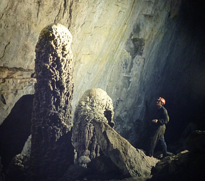 Die Bournillonhöhle zu besuchen, das ist wirklich spektakulär. Wo anders gibt es schon einen 100 m hohen Höhleneingang? So eine Situation ist so außergewöhnlich, daß sich schon einmal Ballonfahrer darin versucht haben, mit einem Heißluftballon zur Decke zu streben. Wilde Kletterer scheinen sich einen Spaß zu machen und klettern im Höhlendach herum. Zurückgelassene Hilfsseile zeugen davon. Je nach Wasserstand reicht ein See bis unter die Trauflinie. Dann fließt ein Teil des Wassers in einen seitlich geschaffenen Stollen, der das Wasser zum E-Werk ableitet. Ein Felssteiglein führt tiefer in die Höhle. Nach links erreicht man eine Brücke, die über mehr oder weniger großen Bach bzw. Fluß führt, oder halb auch ganz verschwinden kann. Noch ein paar Meter weiter und dann ist normalerweise Schluß. Ein Wasserfall versperrt den leichten Weiterweg. Zwei Wege tiefer in den Berg sind möglich. Vor dem Brücklein kann man in einen blockerfüllten Gang hinaufsteigen, der nach einer Art Joch auf der anderen Seite überhängend abbricht in einer Riesenhalle. An der rechten Wandseite ist eine Querung möglich, was aber schon eine gewisse Beherztheit erfordert. Mit den Händen in der Hosentasche und mit dem Verstand auf dem Handybildschirm ist der Absturz vorprogrammiert. Jenseits davon geht es in großen Gängen tiefer in den Berg. Unterwegs stößt man auf die zweite Möglichkeit dorthin zu kommen. Gleich beim Eingang zweigte nämlich nach rechts ein weiterer großer Gang ab. Ist man ihm gefolgt, dann erreicht man auch auf diese Weise das "Village Nègre", eine imposante Tropfsteingruppe, und später die inneren Teile der Bournillon. Normalerweise ist irgendwann mal Schluß an einem Siphon, vor dessen Gefährlichkeit immer gewarnt wird.