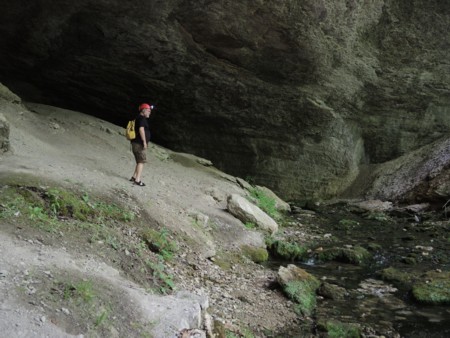 Das Bächlein PlaisirFontaine fließt nach wenigen Kilometern in die Brême, die einen rechten Nebenfluß der Loue darstellt. Schaut man, wo denn das Wasser herkommt, dann kommt zu einer schönen Höhle mit einem mächtigen Eingang. 30 m breit ist er und 10 m hoch, ein Klassiker. In dem 1996 erschienenen Band 3 des Katasters der Höhlen des Departements heißt es noch, daß die ersten 50 m ohne Gefährdung begangen werden könnten. Seit dem 19. Jahrhundert gibt es schon schriftliche Berichte über die Höhle, Courbet diente der Fluß als Malvorlage (keinerlei Eingehen auf die Höhle), in jeder Wanderkarte ist sie eingetragen, Hinweisschilder gibt es in der Gegend daraufhin - und wenn man dann dort ist, dann heißt es: Stop! Der Gemeinderat hat verfügt, daß niemand die Höhle mehr betreten dürfe aus Steinschlaggefahr heraus, die sowohl draußen wie auch in der Höhle gäbe.