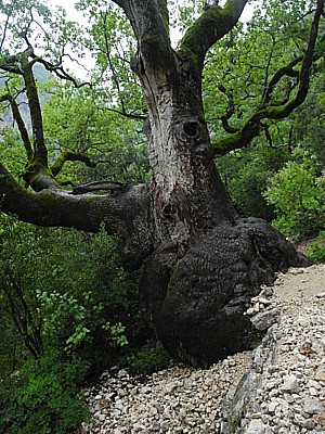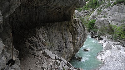Eine zweite sehr beliebte Tour führt von La Maline hinab in die Schlucht und dann einige Kilometer flußabwärts bis zu einer Stelle, ab der nur noch erfahrene Canyonisten und Kanten weiterkommen, weil der Fluß sich hier zwischen zwei Felsen hindurchgearbeitet hat, wo jeder trockene Weg ansonsten endet. Hier drehen dann 99,99 % um. Der Weg ist ausgetreten, viel benutzt, ausgebaut und nicht ohne. Er führt mal über den Fluß auf einer Spannbrücke, mal hoch hinauf und dann wieder hinunter, Drahtseile geben ein wenig Gefühl von Sicherheit, in senkrechte Felsen wurden händisch Passagen hineingeschlagen und gesprengt.