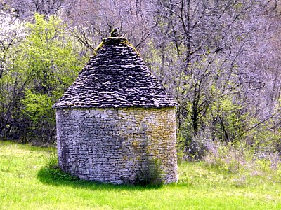 Nur wenige Kilometer weiter dordogneaufwärts liegt Mayronne, ein kleines Dorf. Dort sollte es laut dem ausgezeichneten "guide de la france souterraine" von Minvielle eine Höhlenmühle in den Felsen von Sainte-Marie geben. Trotz intensivsten Bemühungen gelang es uns 2012 nicht, sie zu finden. Ein Kreuzweg war uns unterwegs am Talhang aufgefallen und aus lauter Frust folgte ich diesem bis zur Felswand hinauf. Dafür fand ich dann die Höhlenkapelle von Sainte-Marie, unbeschrieben bei Minvielle. Eine Glocke hängt direkt über dem Eingang und man kann sie betätigen, um seiner Freude akustischen Ausdruck zu verleihen, daß man hier angekommen ist. Das Höhlengitter war offen und nicht abgesperrt. Wahrscheinlich würde es wenig Sinn machen, die Kultstätte vor den Menschen, die hierher kommen, zu schützen, da sie ja nur durch sie ihre Bedeutung bekommt. Innen ist ein kleiner Altar mit vielen Devotionalien und eine Bet- und eine Sitzbank.