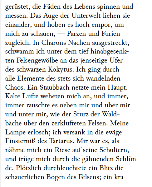 | "Rechts öffnete sich hart an der Burgmauer selbst ein tiefer weiter Schlund, dessen senkrechter Absturz aus einer weißen Felsenwand bestand, auf welcher bogenförmig ein Hügel sich wölbte; und längs dem Rande desselben strebte malerisch ein schöner Hain von Buchen, Eschen und Fichten empor, und krönte mit seinen Schatten die ganze Bogenlinie des hinabgeleitenden Hügels. In diesem Schlunde, dessen untere Gegend der Schloßberg uns hier verdeckte, sollten wir den Eingang zu der unermeßlichen Höhle des Piks antreffen...." | ||