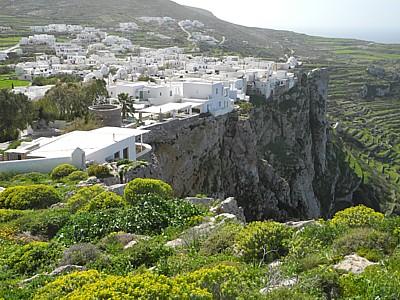In der 1973 erschienenen zweiten Auflage des BLUE GUIDE GREECE von Stuart Rossiter heißt es über Folégandros noch: "From Karavostasis, the harbour, a mule path leads in 40 min. to Khora (240 inh.), with a medieval portion called Kastro." Da hat sich inzwischen viel getan und keiner findet dort nur einen Mulipfad. Natürlich führt auch hier eine breite geteerte Straße vom kleinen Hafen mit ein kleinen Feriensiedlungen rund herum durch ein naturbelassenes Tal, vorbei an einer schneeweiß getünchten Grottenkirche in der rechten Talflanke, 3,5 km hinauf nach dem inzwischen auch schon angewachsenen Hauptort Chora.