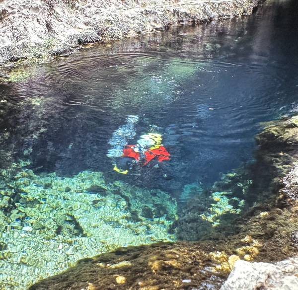 Natürlich ist die Quelle auch von Tauchern schon besucht worden. 30 m weit geht es in einem Schacht hinunter, dann würde der Gang zu eng, um ihn noch mit aufgeschnallten Luftzylindern befahren zu können. Englische Höhlentaucher kamen 1981 ein wenig tiefer, bekamen aber Bedenken wegen der narkotischen Effekte des Nitrogengases. Eine ihrer Unternehmungen war mal ein "picking trip". Sie sammelten all das Geld wieder ein, das die Besucher der Quelle in den Topf geworfen hatten, wohl in dem Glauben, daß ihnen das Glück bringen würde. Es ist schon seltsam. In der berühmten Vauclusequelle im Süden Frankreichs haben die Taucher auch Münzen gefunden. Die ältestesten stammten noch aus Römerzeit! An ganz verschiedenen Orten in ganz verschiedenen Zeitperioden - ganz ähnliche Handlungen und Bräuche. B.C.T. Hague, der englische Taucher, jedenfalls kam mit einem Berg Liremünzen jedenfalls wieder hoch, die den Gegenwert von 4 englischen Pfund hatten. 1989 kam der Schweizer Höhlentaucher Oliver Isler noch tiefer und weiter. Mit einem Heliumgemisch in den Flaschen konnte eine Engstelle auf - 74 m überwunden werden. Man kam noch 50 m weiter, aber bei -82 m Tiefe, da erschien es niemand mehr für vertretbar, weiterzumachen. Dabei muß da noch eine riesige Höhle sein!
