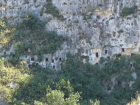 Die Sikuler hätten sich erstmals um 1300 v. Chr. dort angesiedelt. Viel ist davon nicht mehr übrig geblieben, hauptsächlich das Anaktoron, einstmals wohl der Sitz des Stammesfürsten. Was uns heute noch beeindrucken kann, das sind die Grabhöhlen, um die 5.000 sind es. Wer an bestimmten Stellen die steilen Felshänge anschaut, der sieht die schwarzen rechteckigen Öffnungen verstreut überall wie Bienenwaben. Die Lage ist sehr geschützt auf einem Bergsporn zwischen zwei tiefen Flußschluchten, der des Anapo und der des Calcinara.