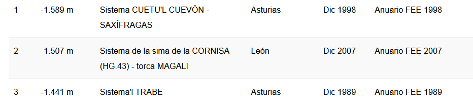Höhlenmäßig gehört Spanien in die "Oberliga". Als 1986 Courbon und Chabert ihren Atlas der größten und tiefsten Höhlen der Erde veröffentlichten, gab es schon 8 Höhlen die tiefer als 1000 m waren und 10, die eine Länge über 15 km aufwiesen. Im Mai 1969 war die längste Höhle Spaniens noch 36 km lang (Complejo Palomera-Dolenicas/Ojo Guarena9 und die tiefste 1.152 m (Compleja Sima San Martin-Tete-Sauvage). Dieses Bild hat sich inzwischen doch sehr nach "oben" verschoben. > siehe https://cec-espeleo.com/grandes-cavidades-espanolas/