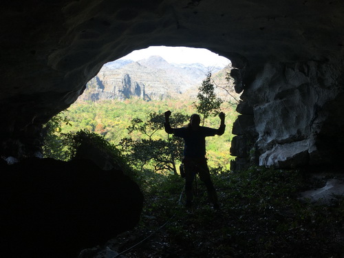 Bereits am ersten Nachmittag, als wir endlich in Ban Na, unserem Stützpunkt für die nächsten Wochen, im Bergland östlich von Thakek angekommen waren, machten wir eine kleine Wanderung in das Gebiet des Nam Don-Flusses. Von ihm führt eine deutliche lange Senke bis zum Eingang der Tham Khai Nau-Höhle am Fuß der Felswand. Wandert man von dort ein wenig weiter, dann sieht man bereits zwei Wandlöcher, eines deutlich, eines verdeckt. Dorthin richtete Peter sein Interesse.