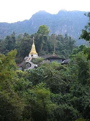 Die Haupthöhle liegt genau unterhalb der großen Stupa. Es ist eher eine große Felsspalte als ein richtiger Höhlenraum. Ein Schutzdach darüber soll wohl erträgliche Bedingungen auch bei Regenwetter schaffen. Der Boden ist mit einem großen roten Teppich bedeckt. An den Wänden finden sich viele viele Bilder und Photos. Auch eine kleine Bibliothek steckt in den Felsen. Eine Überfülle an Buddhastatuen und wohl eine des verehrten Looang Boo Sim Buddhacaro, der dort mehr als 10 Jahre gelebt und gelehrt hat.