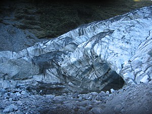 In den Gletscher hineinschauen, hineingehen? Man sieht zwar in den Prospekten, die einen dazu verleiten sollen, die Dienste der Guides zu beanspruchen, lockende Bilder von Mädchen im blauen Eis, aber ohne die Anleitung von "Experten" ist das wohl nicht anzuraten, so zumindest der Eindruck, der öffentlich erweckt werden soll.