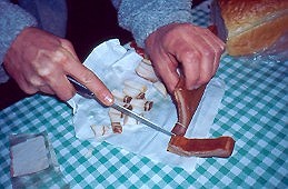 | in den 60er Jahren | Jim Eyre berichtet in seinen recht lesenswerten Buch THE CAVE EXPLORERS an vielen Stellen auch die kulinarische Seite der Höhlenforschung. Ein kleines Beispiel aus dem Bericht über eine Expedition in den Karst von Hrusica. "Later that evening with all the chores done, we sat around the pine table and sampled Habe's cooking. It was excellent, and helped down with a liberal quantity of red wine. The meal made in memorable evening...." p 96 | ||||||