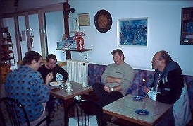 Beim 50. Geburtstag dieses Herrn, der bei der Osterhöhle auf der Fränkischen Alb gefeiert wurde, kamen wir auch in den Genuß eines prima Services - auch das gehört zu "Karst und Küche". Geleistet wurde er u.a. von einer "hochgestylten" Gymnasiallehrerin, die auf engste mit diesem Herrn verbunden ist. Die Küchenmann/frauschaft im Höhlenführerhaus |