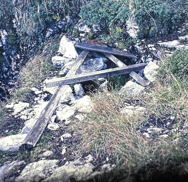tiefe Schachthöhle im Hochwieskopf, Land Salzburg, A 1524/44 Elliptische, maximal 1,5 m weite Schachtöffnung in einem Wiesenhang, zum Schutz des Weideviehs abgedeckt, führt in einen 10 m tiefen Schacht |
