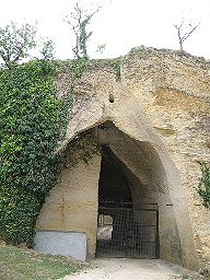 Auch mitten im Doué stößt man auf die unterirdische Erbschaft. Da gibt es eine Destillerie, die in den alten Steinbrüchen angesiedelt ist, eine "Grotte des sarcophages" preist ihren Ort damit an, daß darin noch ein paar alte Steinsärge zu sehen sind, eine Weinkellerei nennt sich "Domaine des Troglodytes" und erhofft sich wohl davon mehr Umsatz, und es gibt auch einige Restaurants inzwischen, die sich in den alten dunklen Krypten angesiedelt haben und wohl auch auf kräftigen Ertrag davon hoffen.