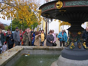Wir fuhren mit dem Bus ab 13 Uhr vom Kloster gemeinsam nach einem dieser genußvollen Mittagessen in Strahlfeld los. Wir waren aber inzwischen soviele Leute schon, daß er gar nicht mehr reichte und ein paar Leute mit dem eigenen Pkw nachfahren mußten. Unterwegs, nach einer Abzweigung bei Cham, sahen wir eine junge Frau neben ihren kleinen Gefährt in tiefen Graben neben der Straße. Sofort war der Kommentar zu hören: "Frauen und Autos..." In Viechtach wurden wir direkt am Marktplatz abgeladen und hatten dort eigentlich bis 18 Uhr Zeit, um uns alles anzuschauen. Details darüber sind auf meiner Webseite über die Erdställe in Viechtach zu lesen. Da natürlich nicht alles so lief, wie es eigentlich geplant gewesen war, und das Wetter sich verschlechtert hatte, d.h. es regnete ab und zu ganz kräftig, war der Vorschlag, doch schon um 17 Uhr wieder mit dem Bus zurückzukehren, ein von allen Teilnehmern akzeptierter. So kamen wir eher zurück, konnten uns von dem auch hier kräftig vorhandenen Dreck gut reinigen, noch ein wenig Einkehr halten, früher mit dem Essen beginnen und auch der Beginn der Abendhauptveranstaltung konnten noch vorverlegt werden.